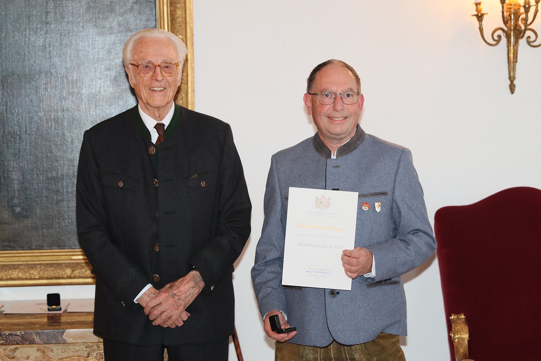 Der Protektor des Bayerischen Sportschützenbundes, S. K. H. Herzog Franz von Bayern, hatte zu einer Feierstunde auf Schloss Nymphenburg geladen, um das von ihm gestiftete Protektorabzeichen in Gold an dreizehn hochverdiente Schützenpersönlichkeiten zu verleihen. Dabei würdigte S. K. H. das ehrenamtliche Engagement der Geehrten. 1. Landesschützenmeister Christian Kühn dankte S. K. H. Herzog Franz von Bayern für seine ideelle, tatkräftige Unterstützung des Bayerischen Sportschützenbundes und für die Stiftung des Protektorzeichens in Gold. Für den Schützenbezirk Oberpfalz war der 1. Gausportleiter, Helmut Massinger aus dem KSV Oberpfalz und Donaugau unter den Geehrten. Während der Protektor die Ehrenzeichen überreichte, hob der 1. Landesschützenmeister die Leistungen der Geehrten hervor. Helmut Massinger ist seit beeindruckenden 27 Jahren 1. Gausportleiter und seit über 40 Jahren im Ehrenamt tätig. Seine ehrenamtliche Karriere begann 1984 bei G´mütlichkeit Luckenpaint als Fahnenträger, eine Position, die er 11 Jahre lang mit Stolz und Hingabe bekleidete. Während dieser Zeit war er auch als Beisitzer in seinem Heimatverein aktiv und zeigte bereits damals sein Engagement und seine Leidenschaft für das Schützenwesen. Mit dem Wechsel zum Waffenwart war sein Weg im Schützenwesen vorgezeichnet. Zunächst kümmerte er sich 10 Jahre lang um die Jugendlichen im Verein und förderte deren Begeisterung und Fähigkeiten im Schießsport. Parallel dazu übernahm er für weitere 9 Jahre die Rolle des Sportleiters und brachte seine Expertise und sein Engagement ein. Seine herausragenden Leistungen blieben nicht unbemerkt, und so wurde der Kreisschützenverband Oberpfalz und Donaugau auf ihn aufmerksam. Sie konnten Helmut Massinger für die Gausportleitung gewinnen, eine Position, die er seit über 25 Jahren mit Bravour ausfüllt. Unter seiner Leitung betreut er rund 13.000 Schützen und sorgt dafür, dass der Sport im Gau auf höchstem Niveau betrieben wird. Durch sein umfangreiches Fachwissen ist Helmut Massinger bei den Sportleitern im Donaugau stets gefragt. Er steht ihnen mit Rat und Tat zur Seite und ist ein unverzichtbarer Ansprechpartner. Darüber hinaus bringt er seine Expertise auch in der EDV ein und betreut diese in kompetenter Weise, was den Donaugau zusätzlich stärkt und modernisiert. Helmut Massinger ist ein leuchtendes Beispiel für ehrenamtliches Engagement und zeigt, wie wichtig und wertvoll der Einsatz für das Gemeinwohl ist. Herzlichen Glückwunsch zu dieser hohen Auszeichnung.